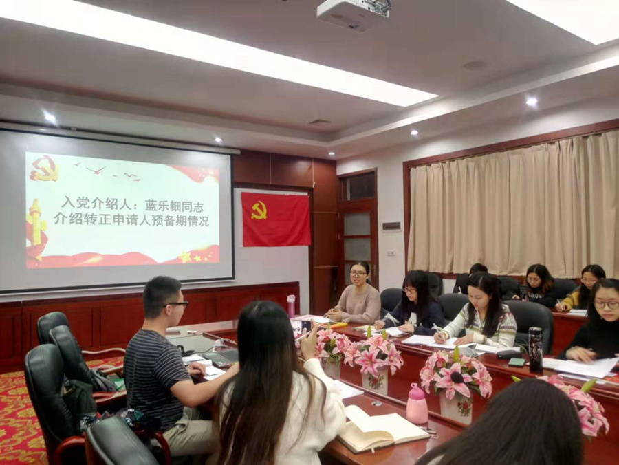 会议上,林赛凤等18名预备党员从思想上、学习上、工作上、生活上等情况依次向党组织进行汇报。汇报完毕后,入党介绍人介绍转正申请人预备期情况;与会党员充分讨论志愿人的思想、工作、学习等方面情况;随后志愿人对支部党员提出的意见或建议表明自己的态度进行。紧跟着,全体正式党员移步到第二行政楼214进行无记名投票。党支部严格按照党员发展程序,经过严格考察,充分讨论和表决,一致同意林赛凤、何思、邓瑜、陈欣、谢莹莹、陈倬纯、谷宛凝、陈凤金、陈咏彤、朱卉茵、吴娃娃、林丹妮、邵梓晴、叶秀美、王伟红、汤林佳、庄伟珊、王佩琪共18名预备党员顺利如期转正,由蓝乐钿同志宣读支部决议,与会全体同志重温入党誓词。