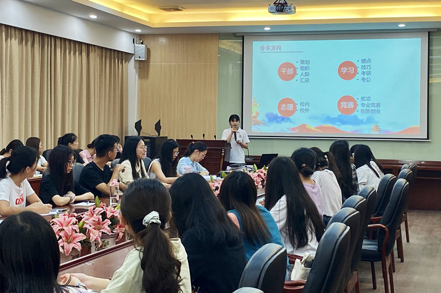 会议第一项议程,主持人陈熙贤介绍本次结对子互助活动的意义、内容和方向。结对子互助活动是把高年级学生中的优秀学生组织起来,对大一学生进行学习、生活、工作等方面经验传授的活动,以达到思想价值引领、学业辅导、职业规划、心理缓释的作用。陈熙贤围绕学习方法、干部经历、参赛经验、志愿服务等四个方面介绍了本次互助活动的目标,如:提高时间管理能力、组织策划能力、沟通交流能力、参赛经验方法等,使20级结对子成员更加明晰活动意义。