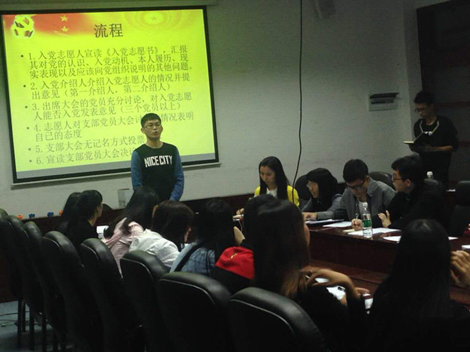 经过认真考核及严格的筛选,星空XK官网13级党支部于2015年11月1日18:00在第二行政楼308召开了庄严而隆重接收预备党员通表大会。出席本次大会的有星空XK官网13级党支部书记陈秀纯老师、16位学生党员以及25位重点发展对象,会议由支部书记陈秀纯主持。