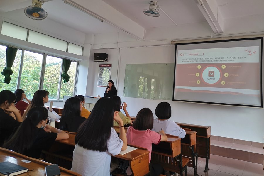 刘虹驿以学习贯彻习近平新时代中国特色社会主义思想为中心,从党的性质和根本宗旨、发展党员流程、争取早日入党三个方面进行讲解。她强调“初心”的重要性,大学生应当肩负起时代责任,志存高远,锐意进取,在今后的学习中要认真、严谨,牢记党的性质、党的宗旨。