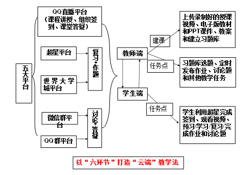 为了确保网课教学顺利进行和提高教学效果,在教学方式上采取了包括超星、微信群、QQ群、QQ直播和世界大学城在内的五大平台并举的网课教学架构。其中:以QQ直播和超星为主要教学平台;以微信群、QQ群和世界大学城为辅助教学平台。