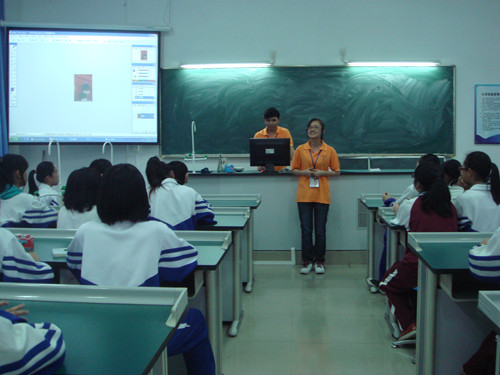 活动开始了,增城学院会计系团委的罗烨同学通过英语小游戏与九佛二中的同学们互动,以轻松愉快的方式向同学们讲述了快乐学英语的方法。游戏结束后她带领学生们大声朗读英语名句,鼓励同学们英语要勇敢地讲出来。接下来会计系团委的钟龙同学则用大家的大合照进行相关的PS教程,为台下同学讲解了一些基础的PS技巧,拓展了大家的计算机知识。二中的同学们认真的听着讲解,做着笔记,开心的与我们的团员互动。活动在大家的欢声笑语中圆满结束。
