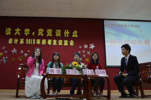 本次交流会邀请了本系优秀在校学生陆上康、唐月娥、杨妹以及本系优秀毕业生颜秀静。交流会在一段视频中拉开序幕,从视频中大一新生道出了入学后的各种疑惑,涉及到了生活与学习、工作、考研、考证等方面。随后师兄师姐也分别凭借自己的经验,为新生们说明大学应该究竟读什么,应该怎么读,才能适应当今社会的需求。 陆上康师兄曾担任系团委副书记,组织策划过与区学联合作朝阳计划,其工作能力得到萝岗区教育局团委副书记和学院领导的肯定。他向新生们指出了大学不应该只是读好书本知识,还应该提升自己的综合素质。唐月娥师姐目前正准备考研,她就从新生问及的考研疑惑进行解答,告诉大家考研最需要的是毅力。而成绩优异、连续三年获得学院“学院优秀学生标兵”的杨妹师姐则重点告诉大家,会计学的专业课应该怎么学,也告诉新生考证需要有方向地考。毕业生颜秀静师姐作为已经毕业的学生,则告诉新生们用人单位对应聘者的要求,增强学生信心。随后互动环节和抽奖环节,新生们积极提问,畅欲所言,无拘无束,师兄师姐们认真回答,亲切的交谈缩短了各自的距离感。