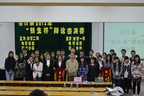 2012年12月8日19:00,华南师范大学增城学院会计系“新生杯”辩论赛总决赛在A109举行。莅临本次辩论赛的嘉宾有会计系12级辅导员汤振华老师、学院学习部正部长肖健源,以及院、各系的学生干部们。评委阵容也非常强大,有院辩论队队长林翰奕、副队长邹洁、肖映坤等。