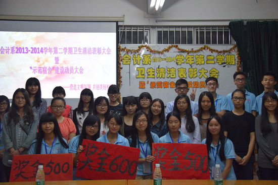 经过一年来大家的共同努力,会计系在卫生清洁方面取得了优异成绩。为了进一步美化我系的文明卫生,创建文明和谐的校园环境,11月30日晚上7点30分在教学楼A305举行了会计系2013-2014学年第二学期卫生清洁表彰大会暨“示范宿舍”建设大会。出席本次大会的嘉宾有会计系学生会主席甘远锌,副主席卢洁莹、何元钰,秘书长池跃莉,纪检部部长谭凤明,保卫部部长江泓,以及13级级委。生活部部长谭敏英担任本次大会主持人。