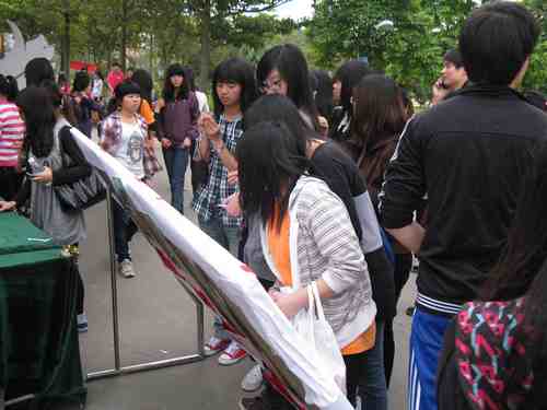 会计系学生会在今天中午便开始筹集道具和准备摆摊用具,经过一翻精心布置之后,三点三十分,会计系工作人员在面包屋对面开始了投票活动,向在校师生展示参赛选手的作品。不一会儿的功夫,我们的宣传活动就迎来很多人的关注,大家都纷纷对参赛选手的作品进行投票。在这次活动中,各位参赛选手都提前到达活动现场,向别人介绍引荐自己团队的参赛作品,想为作品拉票从而获得最高人气奖。
