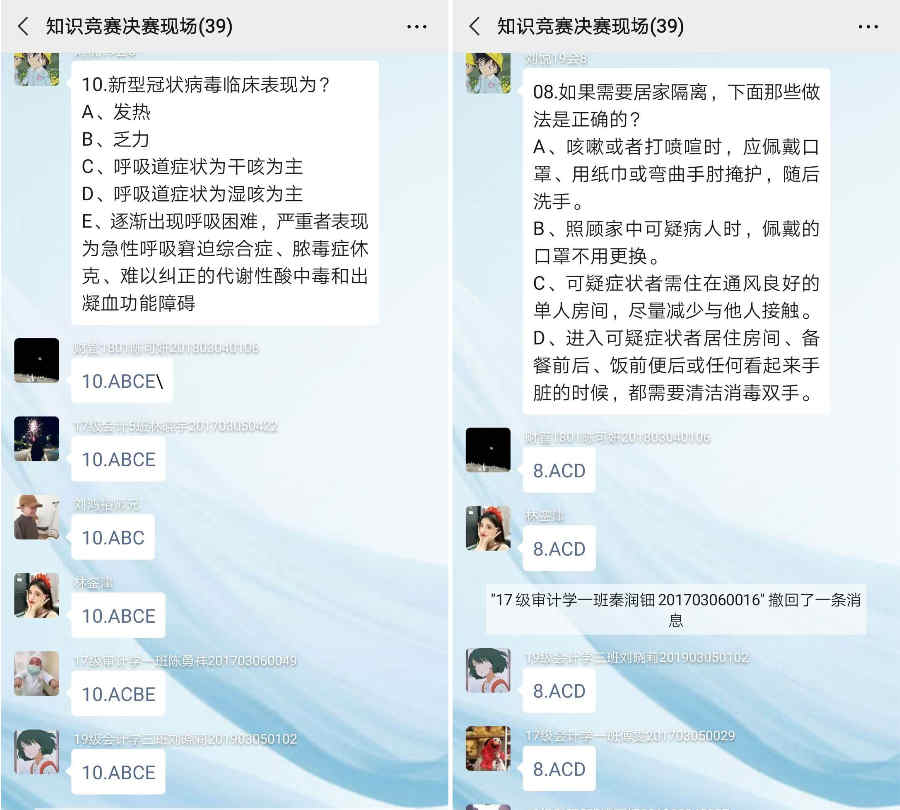 本次知识竞赛采取线上竞答模式,通过问卷星发布问题进行初赛、采用建立微信群抢答模式进行决赛,经统计学院参与初赛总人数达到1359人,在初赛中能够在规定时间内答对25道题以上的有562人,最终有30名同学成功进入决赛。决赛期间,参赛者在短时间内做出反应进行抢答。经过了紧张刺激的抢答环节后,6名选手获得最终奖。