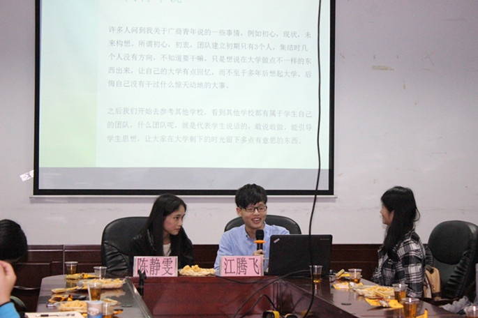 首先,由陈静雯同学向同学们分享了她做微商的心得体会,在选择做微商的过程中,如何去选择一个合适的品牌并且做好来是需要一步一步积累的。在介绍自己代理的产品时,她提出如果想要把一个品牌做强大,就要学会发现产品的亮点。微商无处不在,掌握一定的技巧和方法并加以运用,能够更胜一筹;江腾飞同学则分享了他的创业项目及创业历程的经验,从初接触创业,参与悟空校园、黑白校园等创业项目,到后来开始接触创业比赛,创立广商青年说公众号等等,这些经验都给自己的大学经历增添了一份色彩,开阔了自己的眼界。同时他也阐述身后有个有力的支柱创业团队,能够跟一群志同道合的人,有着共同的理念也是很重要的。