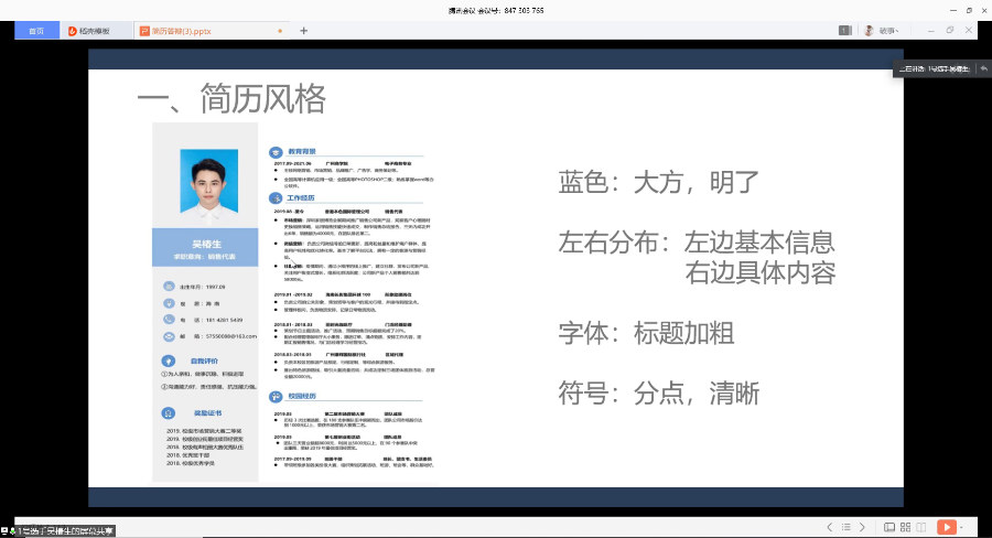 比赛开始前,由主持人介绍本次决赛的比赛规则以及评分规则。紧接着进入选手的简历展示环节和简历诊断环节。比赛分两组进行,第一组5位参赛选手,依次完成展示和诊断环节后进入中场休息环节,该环节旨在为了同学们在制作简历时能够突出简历设计的创新能力,很荣幸邀请到了第九届简历设计大赛的冠军谢桉琦,她以录制视频的方式为大家分享制作简历的经验。正如谢桉琦师姐所说,一份好的简历应当是简而有力的,这让面试官一眼就看到你的求职意向和闪光点,才可以让自己在面试中脱颖而出分享过后,比赛继续进行,直到最后一位选手展示完毕,大赛迎来结束的尾声。