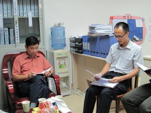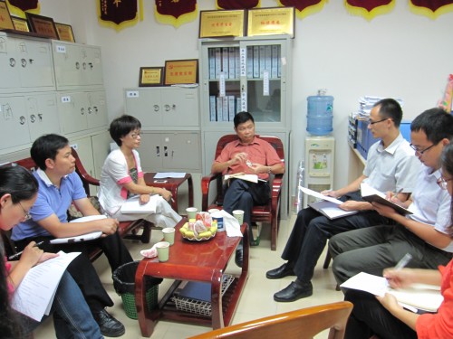 调研会在轻松愉快的气氛中开展,冼院长、学生处领导亲切地与我系辅导员交流,一同探讨“学风建设”的内涵和学风建设的设想。冼院长对我系学风建设所做的工作表示肯定,同时对我系辅导员老师与专任老师之间的沟通,以及两者对学生的密切关注表示赞扬,并查看了各班学风建设档案,为我系学风建设提出了:创造性开展学风建设、对学生考研引导要及早等等宝贵意见。