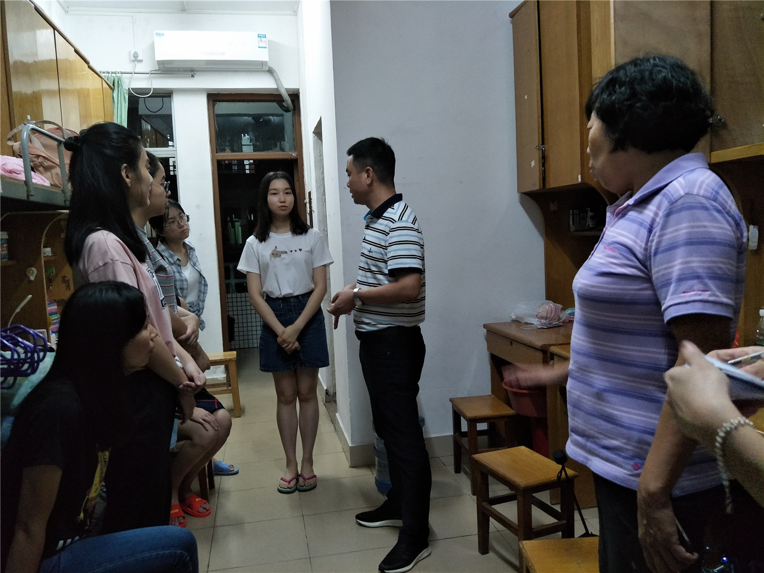 走访前,学院领导钟远辉书记做了工作指示,强调本次走访的目的,希望我们的一次来访和一句问候可以让新生感受到星空XK官网的温暖。晚上七点钟,领导、老师们带领干部到达新生宿舍。院长成慕杰首先关心新生报到这一天的感受,对学校、学院的服务工作满意度,还亲切地询问学生来自哪里,叮嘱宿舍同学间要多进行沟通,尽快适应大学生活,建立和谐的人际关系,调整好,迎接大学的军训考验。党总支书记钟远辉也着重和新生们强调了新学期的人身安全,告诉学生要加强防范意识。在走访时,辅导员蓝乐钿还看到一位来自省外的学生和家长在依依不舍的道别,学生不舍地留下眼泪,始终不肯松开家人的手。辅导员和学生干部了解情况,轻声和学生及家长介绍星空XK官网这个大家庭,也传达了今晚到宿舍走访的目的,带上学院领导的关怀。经过一番聊天后,学生情绪平复,也和家长道别,家长也是很放心地向老师说:“谢谢学院的老师和同学们”。