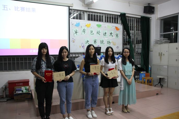 决赛现场,选手逐一上台展示设计作品与阐释其设计理念。“黑与白我的个性包包”是选手李晓霞的主题,设计的理念是现代年轻人追求个性,黑白最具代表性,颜色简单却不失个性。林颖和林依玲共同创作的《兔子与鸟》作品象征的是一种友谊,作者设计的意义是友谊无极限有共同爱好与追求的就能做朋友。利斌豪把自身的志愿服务意识融入作品《海上灵魂钢琴师》中,通过作品表达了有梦想就要去坚守。李乐欣的“鲤鱼单肩包”富有深刻的寓意,鲤鱼单肩包寓意着大学生像鲤鱼一样在学习做事方面鱼跃龙门、奋发向前。吴意的“My Friend”设计理念是倡导保护动物从我做起。陈梓娟的“蓝纹”主题选取的是平行对称关系进行设计,设计理念源于母亲节。李惠的《摩登时代》表达了她自身的兴趣爱好。吴仰玲设计出单肩包“同行”,希望手与脚同行背着包包在走过的地方留下美好的印记。选手作品展示完毕后,在评分结果统计期间宣传部成员为大家表演杯子舞,精彩的表演将现场气氛推至又一个高潮。最后,大赛决出了各级奖项获得者,他们分别是一等奖李乐欣,二等奖吴仰玲,三等奖林颖、林依玲,优秀奖李惠、利斌豪、陈梓娟,最佳号召力和创意奖由吴意、李晓霞获得。