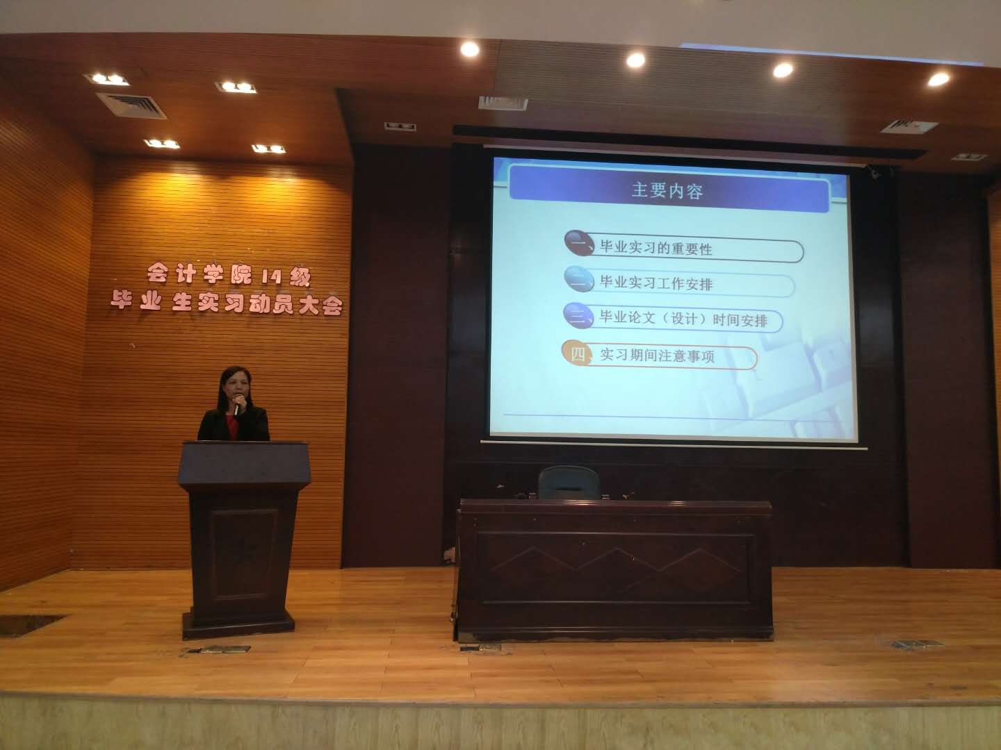 动员环节结束后,两位提前实习的优秀学生代表进行经验分享,主要从自身实习过程中的一些经验及体会进行分享,从作为一个不易让人接纳的实习生角色,转变为能独挡一面角色的成功经验与同学们交流分享,使同学们受益匪浅,现场迎来同学们的阵阵掌声。