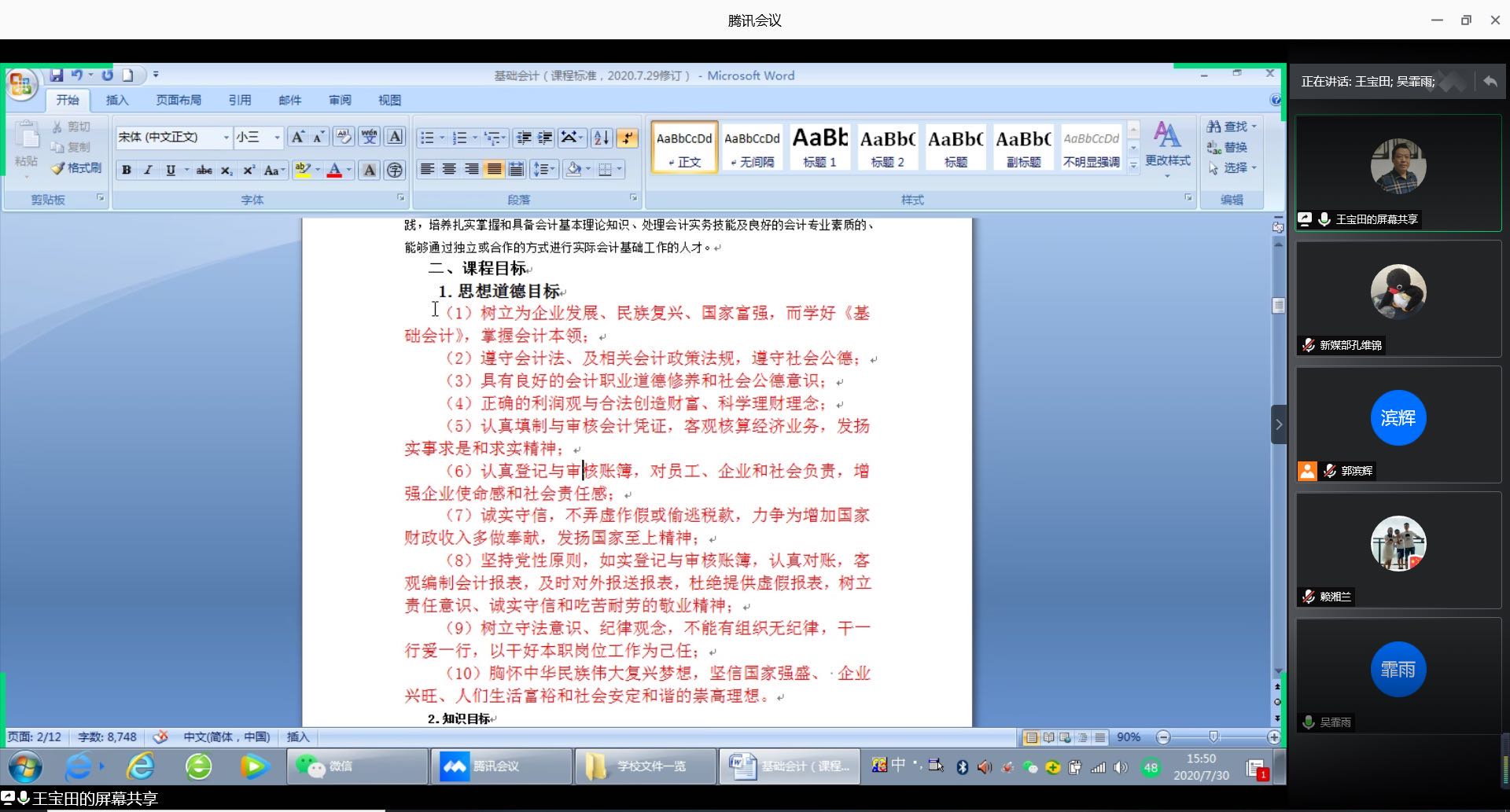 为了进一步贯彻落实学校教学工作会议精神,深化教育教学改革,以不断满足星空XK官网学子发展的需求,星空XK官网于7月30日下午三点通过腾讯会议召开课程标准修改会议。会议由星空XK官网副院长陈德余主持,星空XK官网院长余浩、编写课程标准负责人、专业负责人、教研室主任等教师参加了此次会议。
