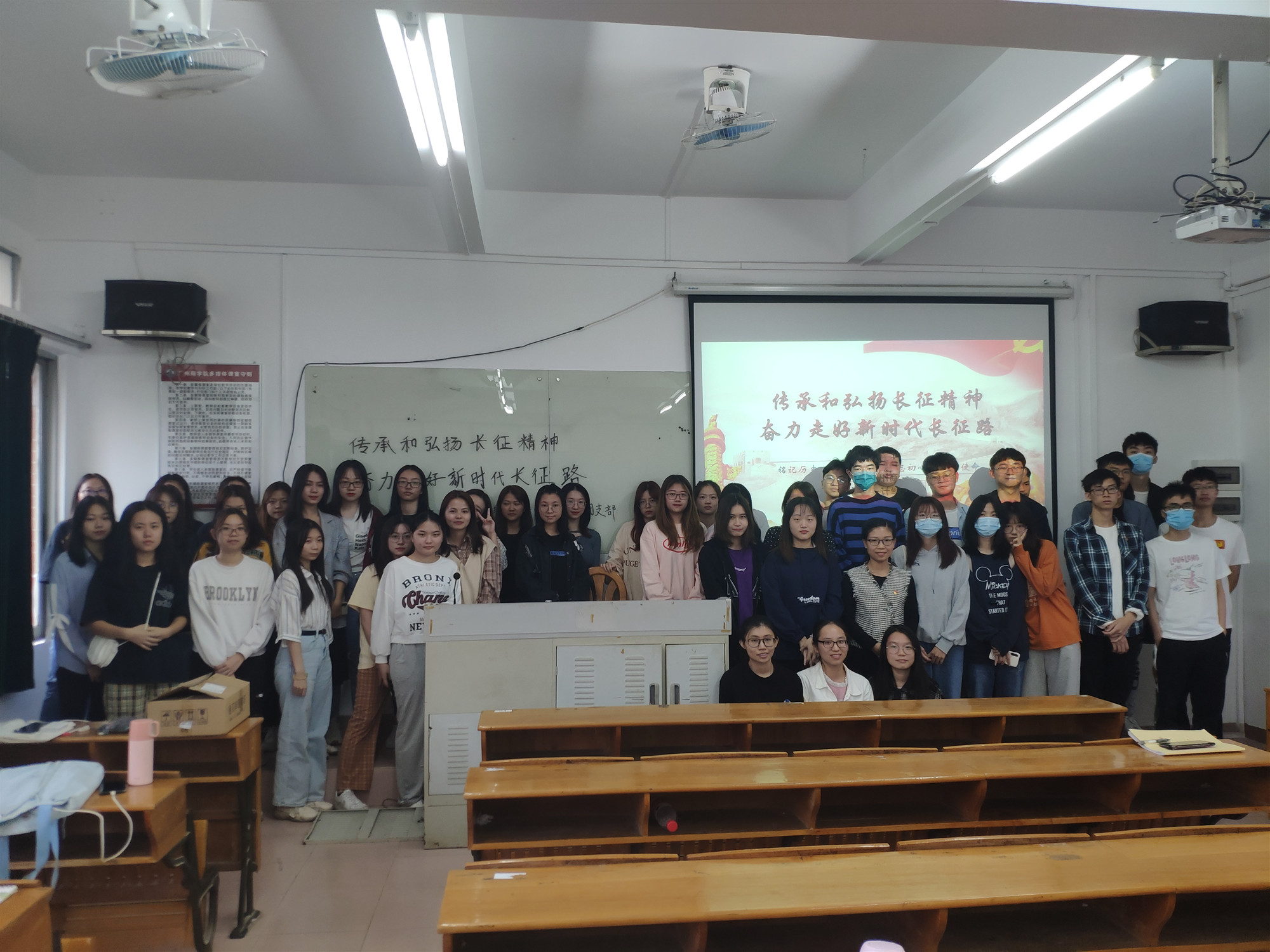 全体同学在奏唱国歌、宣读入团誓词中开始了本次活动。在团支书黄钰纯的带领下,全体与会人员通过回顾长征路,讲述红军长征的历史背景和历史事实,再一次重温红军长征的伟大壮举。其中通过“看图猜词”的游戏环节让同学们积极参与其中,更为深刻地了解长征精神。通过学习习近平总书记的长征箴言,将“一个时代有一个时代的主题,一代人有一代人的使命,新长征路上每一个中国人都是主角。”这一关于新长征路的强调贯穿本次活动。学生代表练赋琳同学、李金钿同学通过自身经历向大家更好地传达了长征精神,将长征精神拉近到同学们当下的生活学习中。在“不忘初心,走好新的长征路”这一环节,通过观看《这就是中国》短片让大家了解从长征开始的建国、强国道路,了解当代青年如何用长征精神走好新长征路,做一个有担当的时代青年。最后廖小慧老师总结本次班会,她再次强调了长征精神的内涵,即把全国人民和中华民族的根本利益看得高于一切,坚定革命的理想和信念,坚信正义事业必然胜利的精神;为了救国救民,不怕任何艰难险阻,不惜付出一切牺牲的精神;坚持独立自主、实事求是,一切从实际出发的精神;顾全大局、严守纪律、紧密团结的精神;紧紧依靠人民群众,同人民群众生死相依、患难与共,艰苦奋斗的精神。老师强调同学们要时刻做好准备,迎接生活、工作、学习上任何的一个困难体现。面对问题,面对事情,要有自己的解决方法。不同的方式方法会达到不同的一个效果,老师通过红军长征指导同学们在遇到困难的时候要及时变通,及时调整方法。廖小慧老师表示,同学们应顾全大局,严守纪律、紧密团结、互助友爱。当今的一个社会,不是一个人就能完成所有的事情,大家要懂得通力合作,每一个人其实都可以为班级做出贡献。