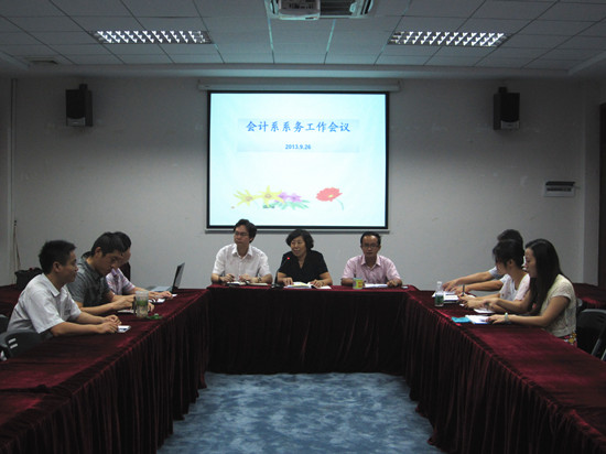 2013年9月26日下午,会计系在D308会议室召开系务工作会议,讨论落实学院重点工作。会计系主任成慕杰教授、副主任凌辉贤、党总支书记李锦堂、各教研室主任、系办公室老师参加了会议。会议由成慕杰主持。