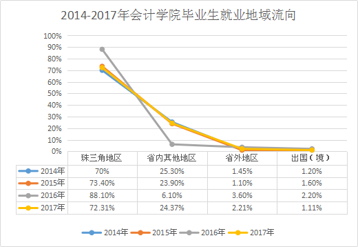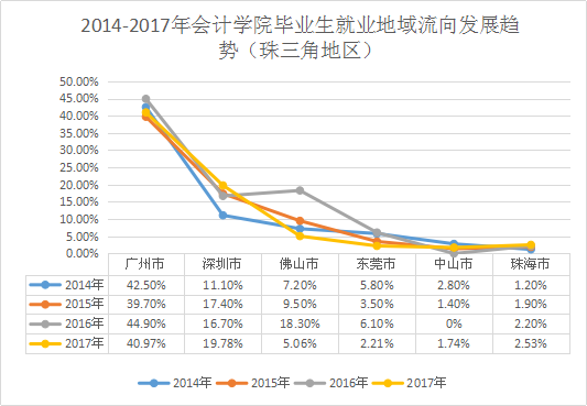 图1-4 2014-2017年会计学院毕业生就业地域流向发展趋势(珠三角地区)